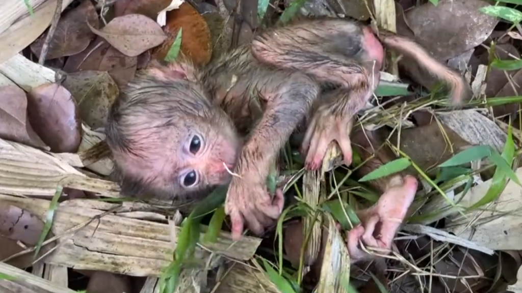 The newborn baby monkey lay helpless in the flooded field, his tiny body barely strong enough to lift his head. Muddy water surrounded him, soaking…