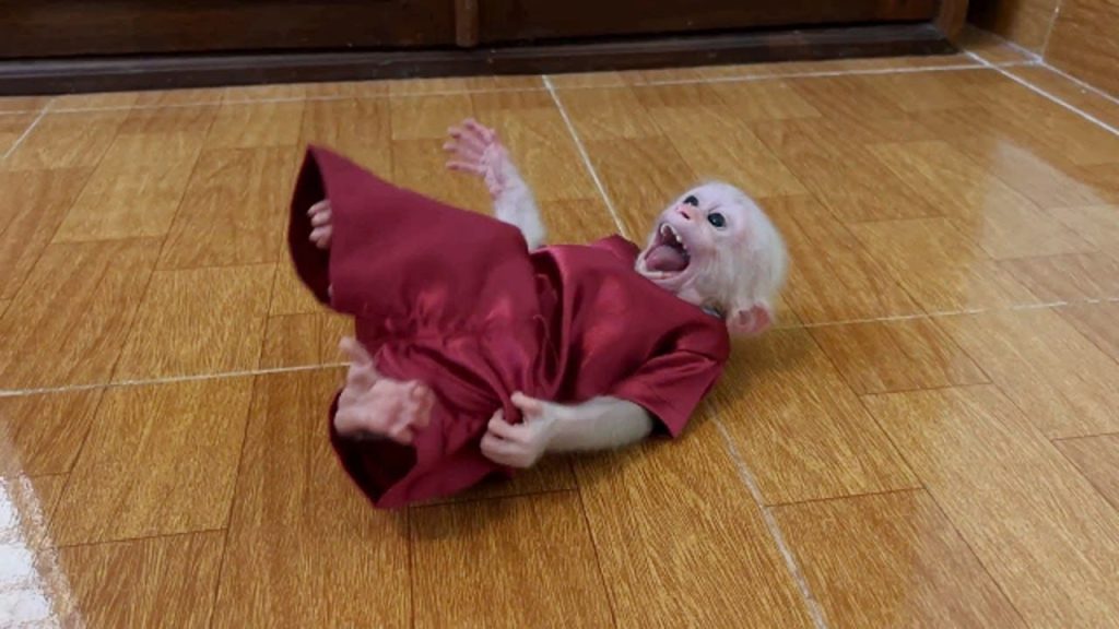After a warm bath, the little monkey sat wrapped in a soft towel, his fur still damp and fluffy. The water had washed away the…