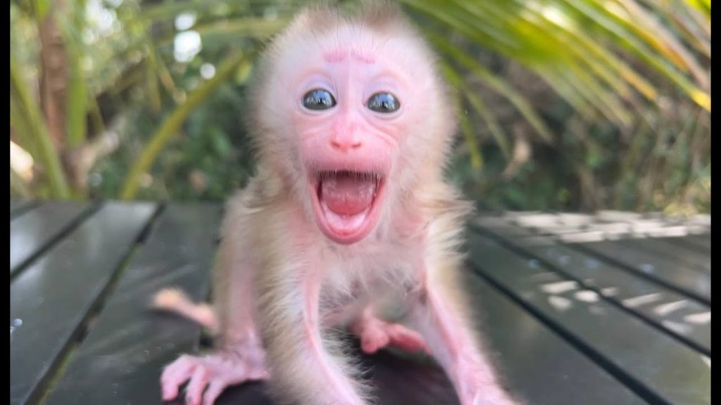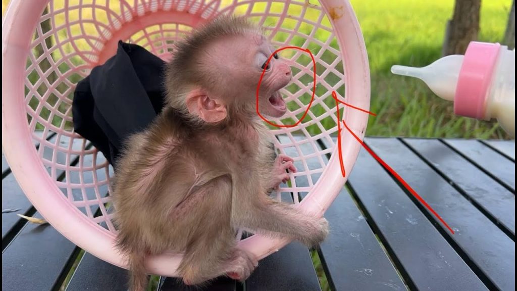 Baby monkey Shala sat on the table, her tiny legs dangling, her face already twisted with frustration. Nothing terrible was happening, yet everything felt wrong…