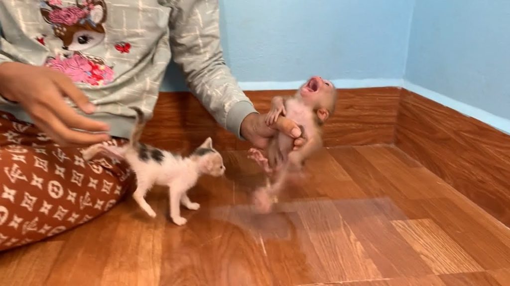 On the floor, the new baby monkey cried uncontrollably, body stiff with fear. His tiny arms trembled, legs kicking weakly, voice breaking into sharp, panicked…