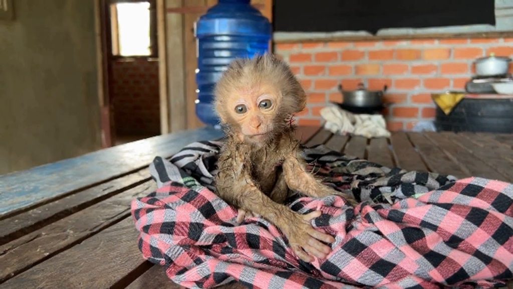The poor baby monkey was found lying near the edge of a farm, his tiny body trembling in pain. One of his legs was injured, swollen and scratched, likely caused by a farmer who chased him away without mercy. He tried to move but failed, letting out weak cries that barely carried across the open land. Fear and pain wrapped tightly around his fragile body.