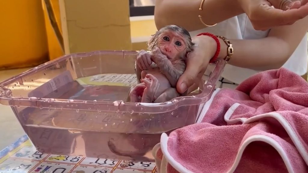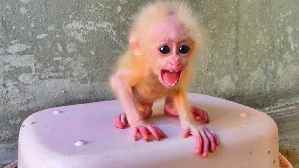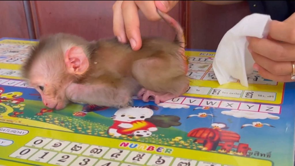 The moment the baby monkey saw the milk, his loud crying slowly became softer.