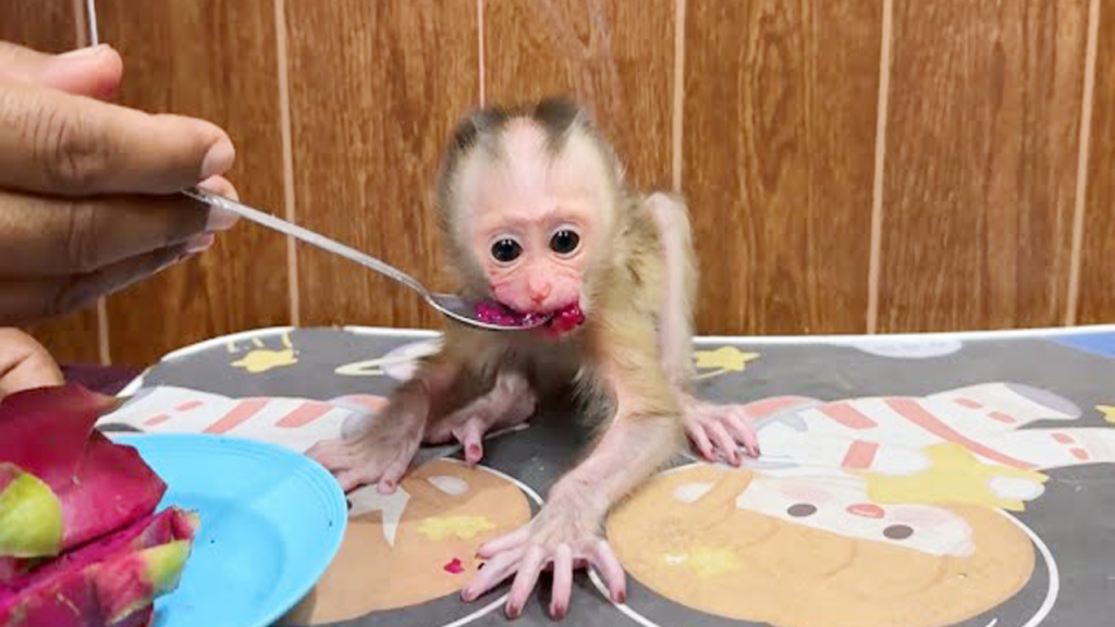The early morning sun cast a gentle glow across the small nursery corner, where a tiny newborn baby monkey lay wrapped in a soft towel. Her little body was still fragile, her fur thin, and her big dark eyes blinked curiously at the new day. Today was special — it was her first taste of red dragon fruit.