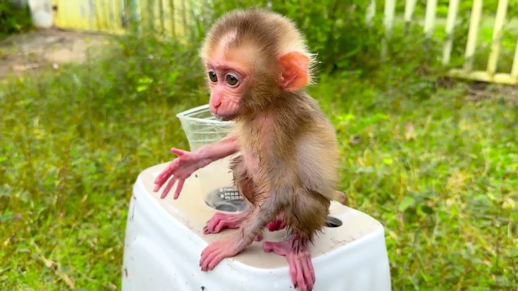 It was a quiet afternoon in the garden when baby monkey Nika began to fidget in her little blanket. She had just finished drinking milk and was sitting near her mom, her tiny hands clutching the edge of her cloth. Everything felt safe and warm — until her mom stood up.