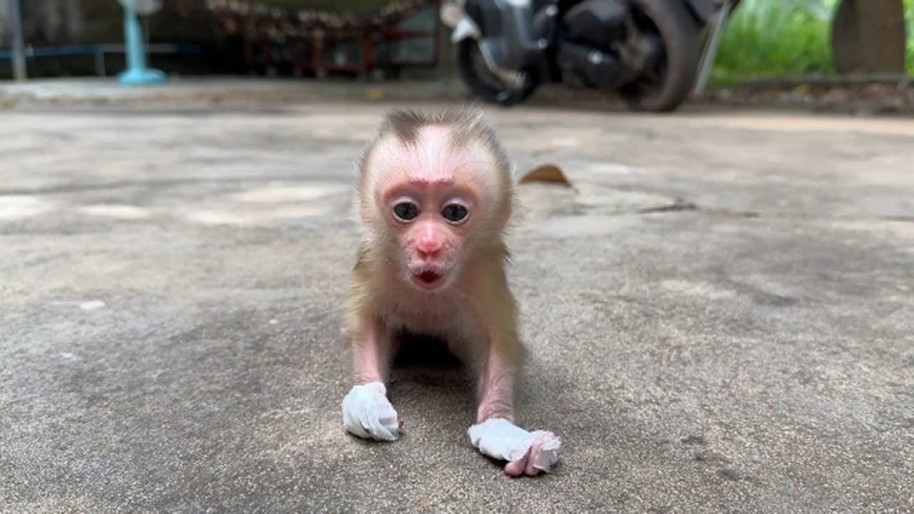 The sun was sinking low, casting long golden rays across the quiet yard. In the middle of it sat a tiny baby monkey, trembling softly as he cried out again and again, his voice filled with pure sadness. His name was Miko, and today, he just wanted one thing — his mom.