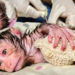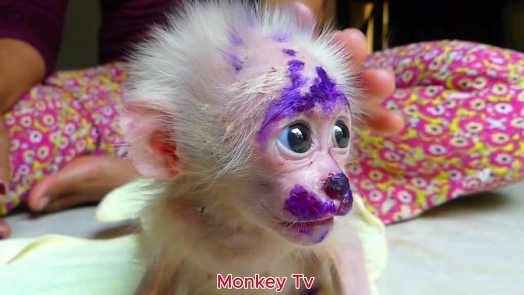 The skinny baby monkey sat trembling in the caretaker’s lap, his tiny ribs showing with every shallow breath.