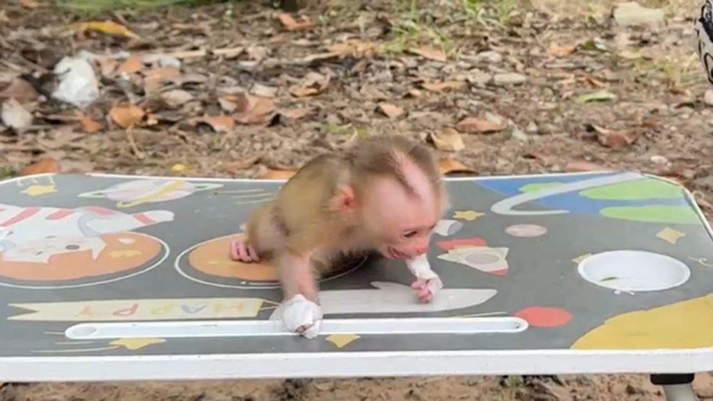 It was a peaceful afternoon at home, with sunlight filtering through the window and a gentle breeze swaying the curtains. Baby monkey Minea was sitting…