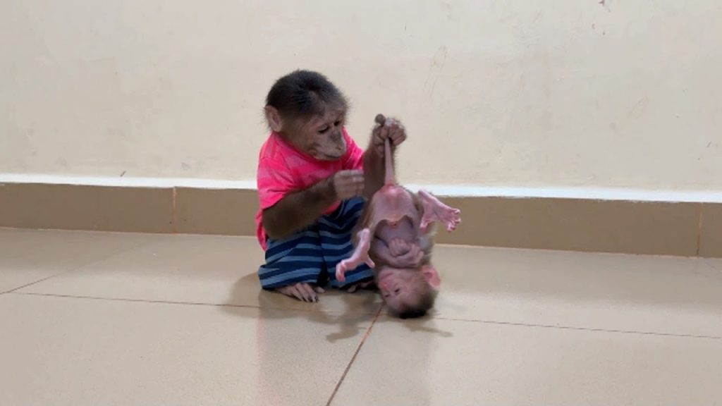 Baby monkey Mini stood stiffly on the outdoor ground, her tiny body tense with stubborn energy. The fresh air, the open space, and the scattered…