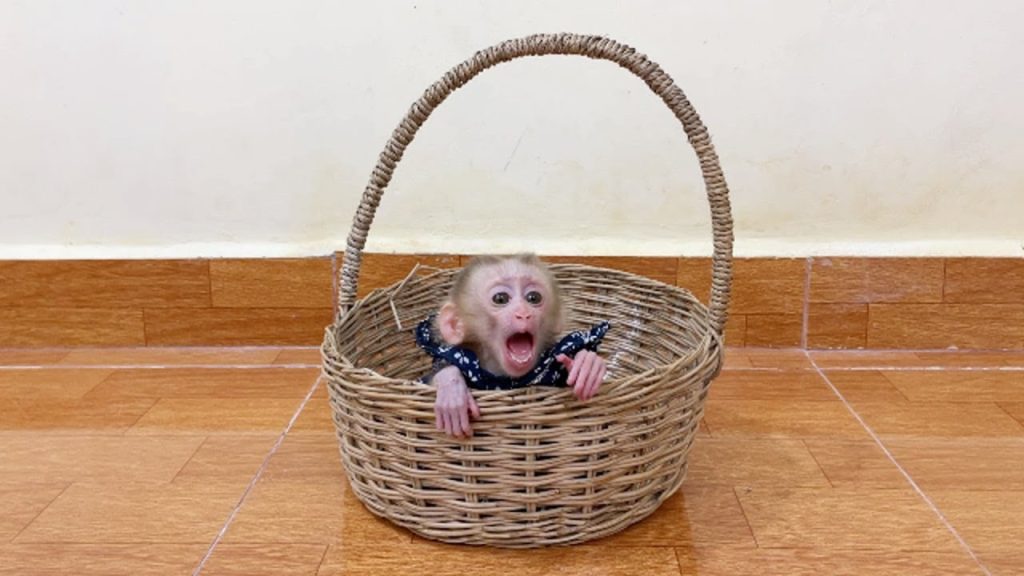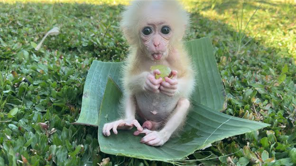 Early in the morning, when the yard was still quiet and fresh with dew, a tiny baby monkey sat gently on a wide banana leaf…
