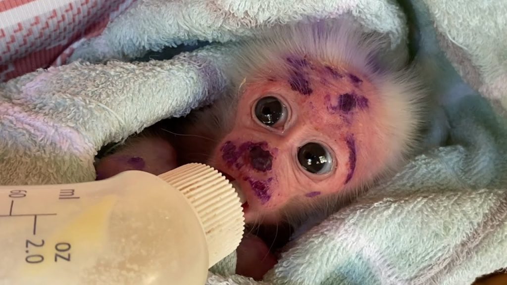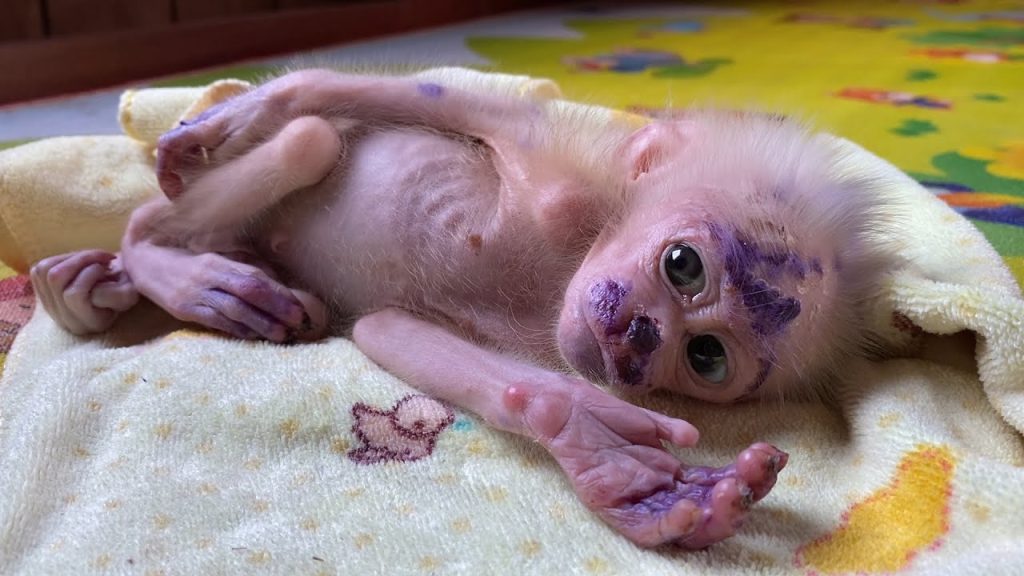 The baby monkey sat quietly, his small body leaning into warmth while his sore face told a painful story. A red wound rested near his…